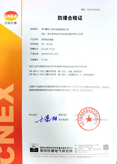 徐州鑫友工控科技發(fā)展有限公司消防電動(dòng)裝置獲防爆合格證