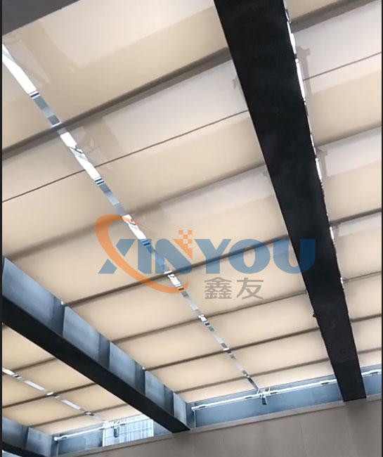 頂面系統(tǒng)選用FSS電動遮陽簾,即每套遮陽簾系統(tǒng)包含一套管狀的驅(qū)動電機(jī)和一套FSS專用的彈簧機(jī)構(gòu)系統(tǒng)通過電機(jī)帶動卷繩器的旋轉(zhuǎn)拉動鋼絲,牽引面料,從而達(dá)到遮陽作用。電機(jī)反轉(zhuǎn)則可通過彈簧的反作用力收回面料,可實(shí)現(xiàn)采光效果。